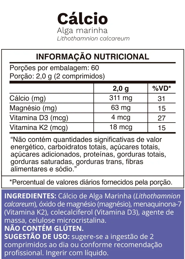 O Cálcio de Algas Marinhas é uma fonte sustentável e segura para o consumo do mineral que é tão importante para a saúde geral. Ele auxilia no fortalecimento de ossos e dentes, funcionamento do sistema neuromuscular, manutenção dos níveis do nutriente no sangue, processo de divisão celular, metabolismo energético, entre outras funções. O Suplemento de Cálcio da Ocean Drop já vem com vitamina D, vitamina K e magnésio que auxiliam na conservação óssea, formação dos ossos e manutenção de níveis de cálcio no sangue, respectivamente.