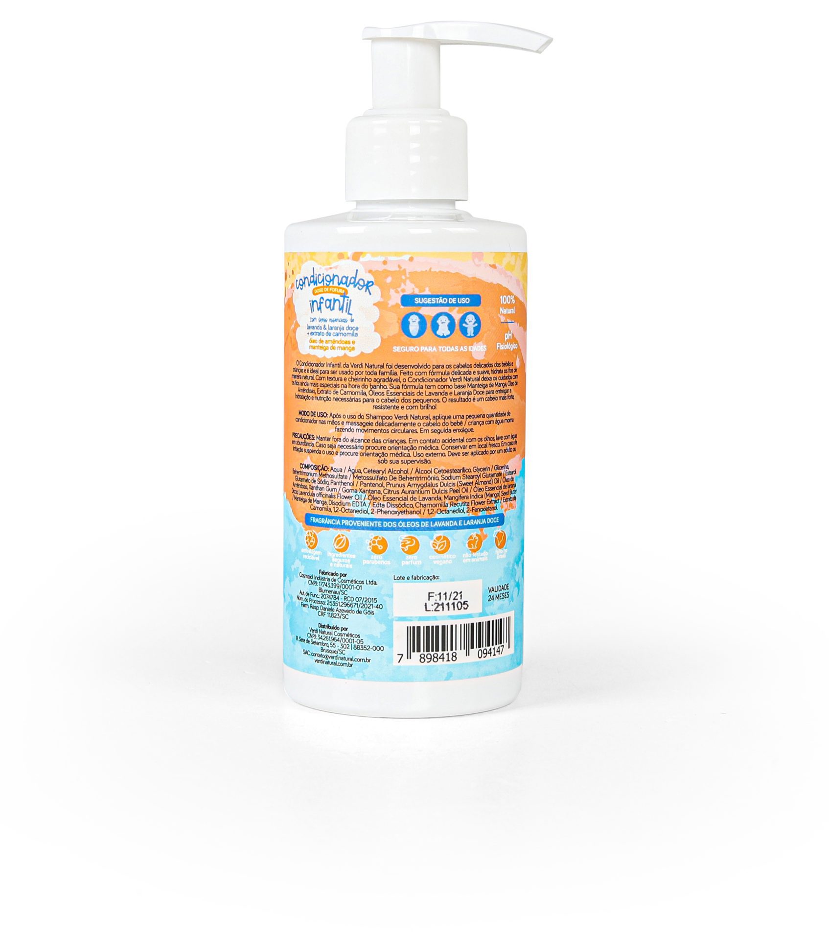 Condicionador Infantil 100% Natural com Oleos essenciais de Lavanda e Laranja doce e Extrato de Camomila